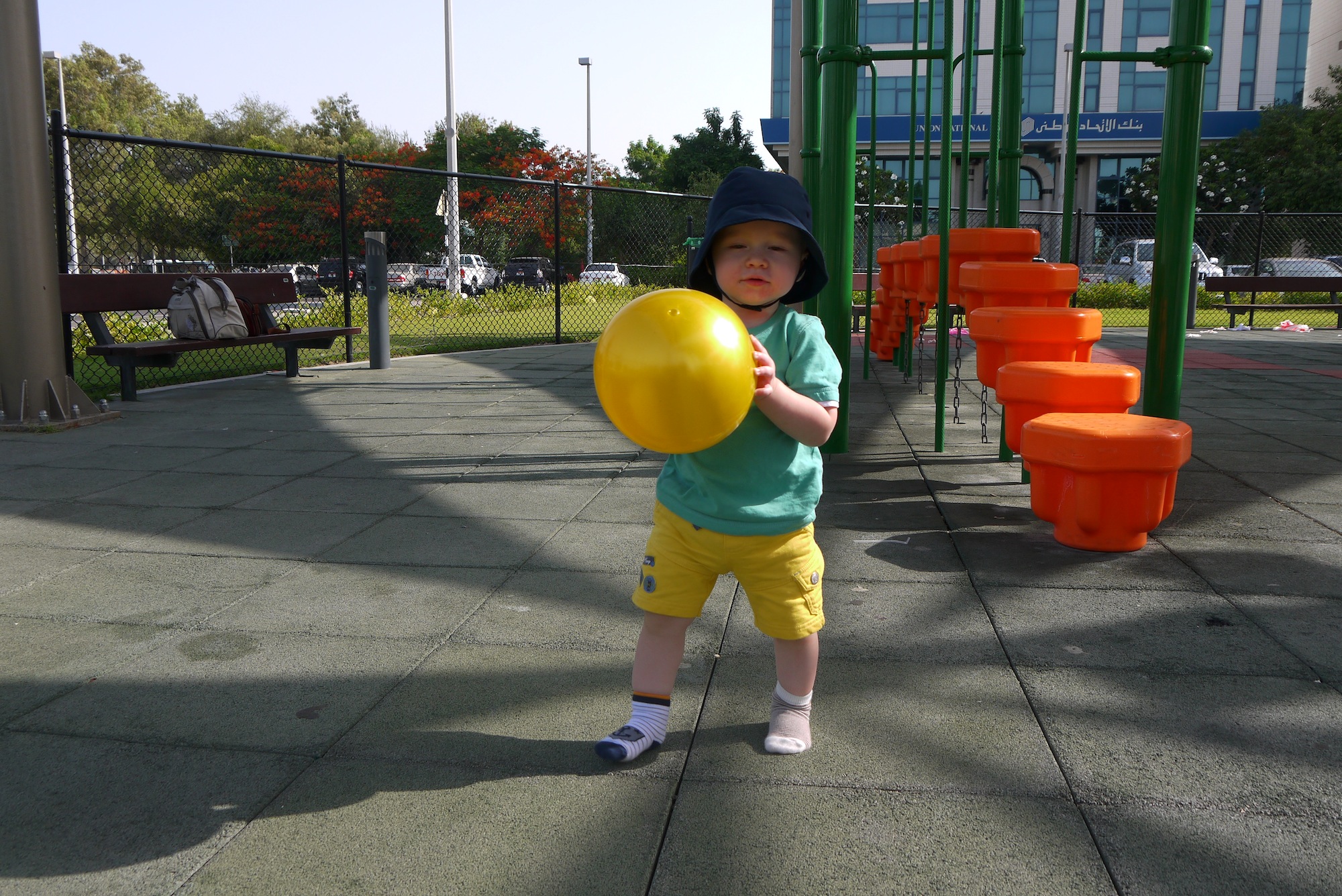 Hey. The end of the school year is finally wrapping up. It is also getting hotter. Here are some pictures of Felix playing around a play area that is close to our apartment. It was around 8 am but it was still hot. We are already looking forward to a “cool” summer in the States.