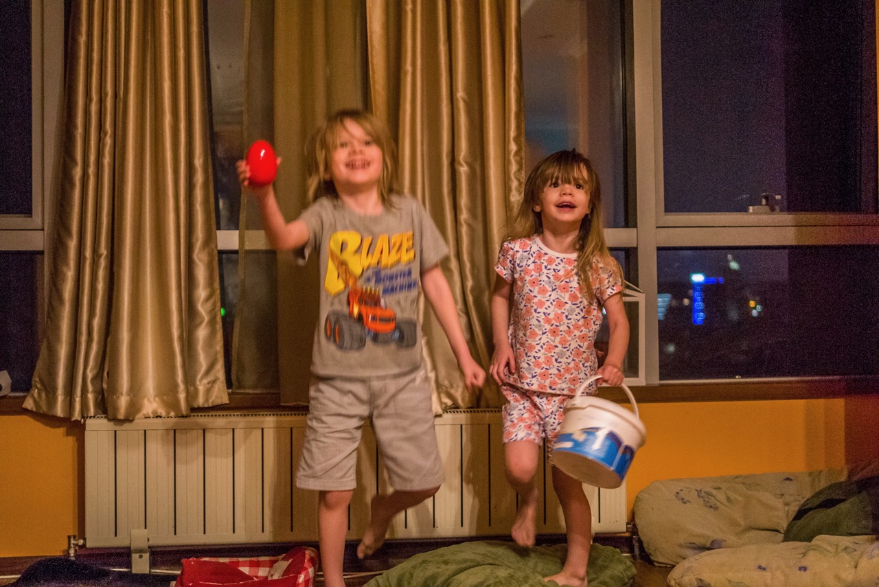 The Easter Bunny came and hid some eggs. The eggs were filled with M&M’s and some chocolate rabbits. Quora and Felix liked looking for the eggs. They also found a book in their Easter Buckets.